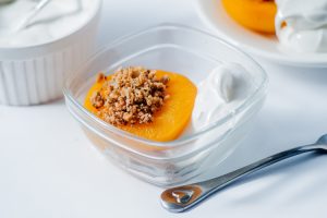 3. Bake 30 to 35 minutes until peaches are soft and filling is lightly brown. Serve warm. If desired, drizzle with honey or a dollop of sweetened whipped coconut cream.